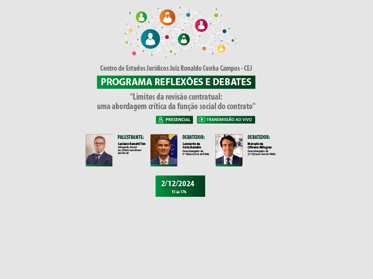 Magistradas e magistrados, servidoras e servidores, assessoras e assessores, assistentes de gabinete, juízes leigos e juízas leigas, auxiliares de justiça, estagiárias e estagiários, colaboradoras e colaboradores terceirizados do TJMG e público externo.Objetivos do “Programa Reflexões e Debates - Tema: Limites da revisão contratual: uma abordagem crítica da função social do contrato“