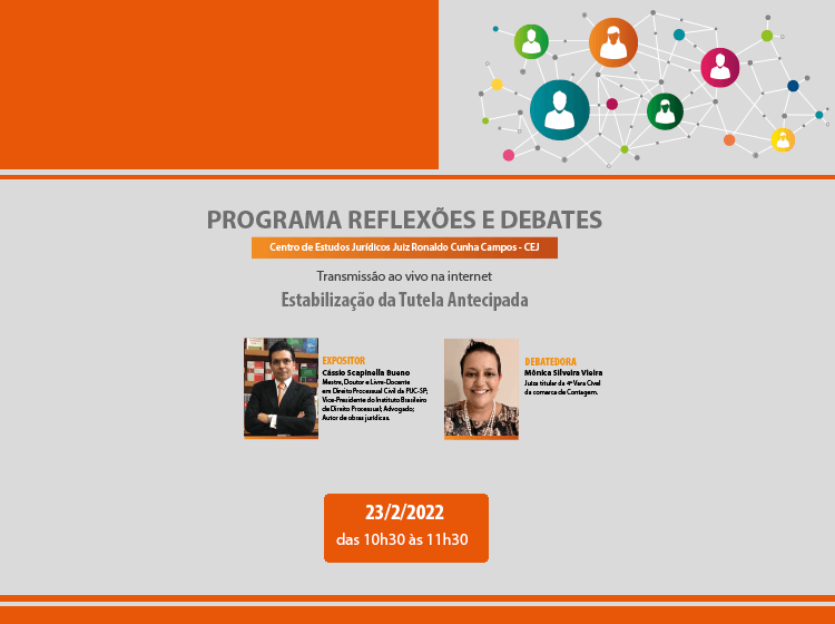 De ordem do Excelentíssimo Senhor 2º Vice-Presidente do Tribunal de Justiça do Estado de Minas Gerais e Superintendente da Escola Judicial Desembargador Edésio Fernandes – EJEF, Desembargador Tiago Pinto e do Excelentíssimo Senhor Coordenador do Centro de Estudos Jurídicos Juiz Ronaldo Cunha Campos – CEJ, Desembargador José Marcos Rodrigues Vieira, comunicamos a realização do 29º Programa Reflexões e Debates, com o tema: Estabilização da Tutela Antecipada, conforme abaixo especificado: