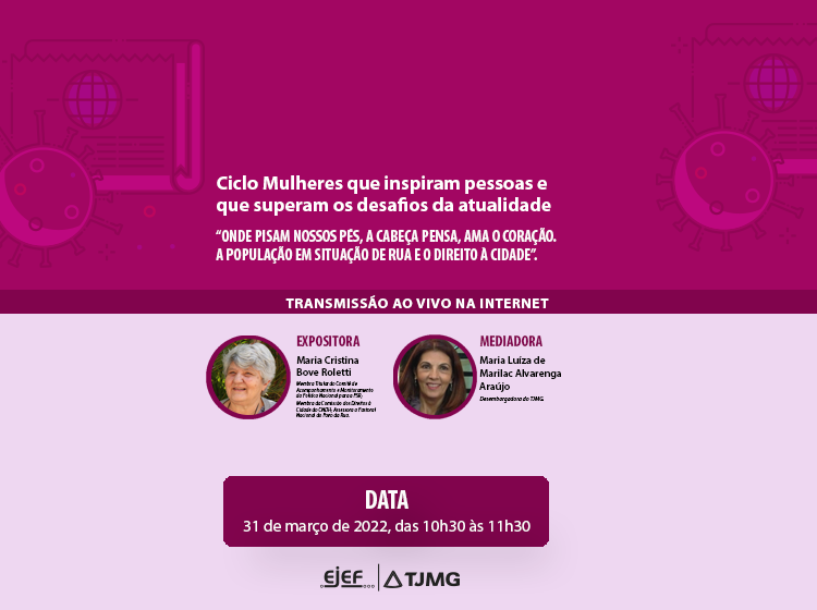 De ordem do Excelentíssimo Senhor 2º Vice-Presidente do Tribunal de Justiça do Estado de Minas Gerais e Superintendente da Escola Judicial Desembargador Edésio Fernandes – EJEF, Desembargador Tiago Pinto, comunicamos que estarão abertas as inscrições para o Ciclo mulheres que inspiram pessoas e que superam os desafios da atualidade com o tema “Onde pisam nossos pés, a cabeça pensa, ama o coração . A população em situação de rua e o direito à cidade”, conforme abaixo especificado: