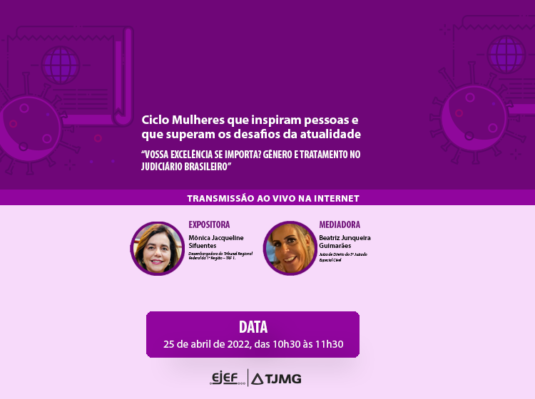 De ordem do Excelentíssimo Senhor 2º Vice-Presidente do Tribunal de Justiça do Estado de Minas Gerais e Superintendente da Escola Judicial Desembargador Edésio Fernandes – EJEF, Desembargador Tiago Pinto, comunicamos que estarão abertas as inscrições para o Ciclo mulheres que inspiram pessoas e que superam os desafios da atualidade com o tema “Vossa Excelência se importa? Gênero e tratamento no Judiciário Brasileiro”, conforme abaixo especificado:
