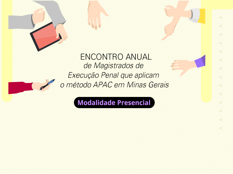 De ordem do Excelentíssimo Senhor Desembargador Renato Luís Dresch, Segundo Vice-Presidente do Tribunal de Justiça do Estado de Minas Gerais – TJMG e Superintendente da Escola Judicial Desembargador Edésio Fernandes – EJEF, e do Excelentíssimo Senhor Desembargador Elias Camilo Sobrinho, Coordenador-Geral do Programa Novos Rumos da iniciativa para Consolidação e Ampliação da Política de APACs em Minas Gerais, comunicamos que estarão abertas as inscrições para o “Encontro Anual de Magistrados de Execução Penal que aplicam o método APAC em Minas Gerais”, na modalidade presencial, conforme abaixo especificado: