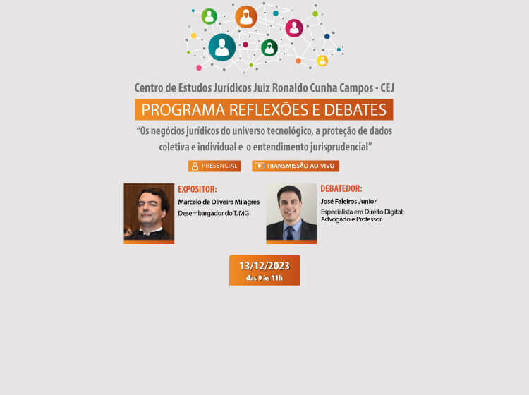 De ordem do Excelentíssimo Senhor 2º Vice-Presidente do Tribunal de Justiça do Estado de Minas Gerais – TJMG e Superintendente da Escola Judicial Desembargador Edésio Fernandes – EJEF, Desembargador Renato Dresch e do Excelentíssimo Senhor Coordenador do Centro de Estudos Jurídicos Juiz Ronaldo Cunha Campos – CEJ, Desembargador Saulo Versiani Penna, comunicamos que estão abertas as inscrições para o Programa Reflexões e Debates, com o tema: “Os negócios jurídicos do universo tecnológico, a proteção de dados coletiva e individual e o entendimento jurisprudencial”, conforme abaixo especificado: