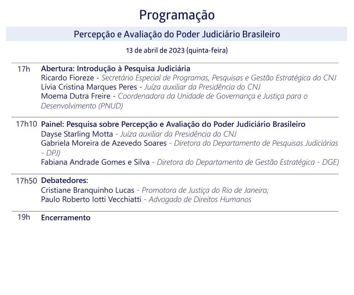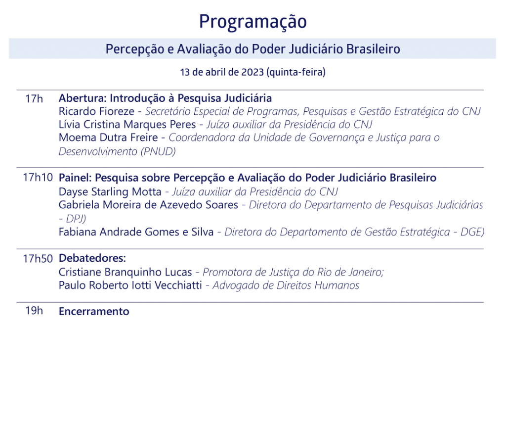 Link de inscrição: https://eventos.cnj.jus.br/inscricao-seminarios-de-pesquisas-empiricas-aplicadas-a-politicas-judiciarias-percepcao-e-avaliacao-do-poder-judiciario-brasileiro