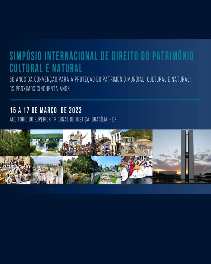 Convenção para a Proteção do Patrimônio Mundial, Cultural e Natural: os próximos cinquenta anos, no período de 15 a 17 de março de 2023, na modalidade presencial, em Brasília-DF. O Simpósio Internacional visa passar em revista as cinco décadas da Convenção, analisando suas conquistas, lacunas e desafios, com um olhar para o futuro. Também será analisada em profundidade a legislação brasileira de proteção ao Patrimônio Cultural e Natural, bem como a nossa jurisprudência a respeito desta relevante temática. Na oportunidade, os juízes participantes divulgarão a “Declaração Judicial de Brasília sobre a Proteção do Patrimônio Cultural e Natural”.